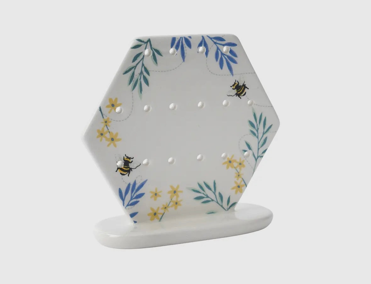 A practical holder to store all your lovely pairs of earrings. Features a floral and bee illustration.